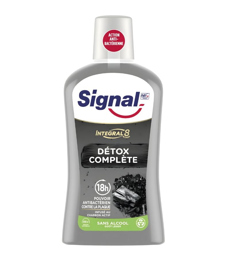 Signal Mouthwash 500ml Protect Complete provides powerful antibacterial protection for up to 18 hours. Infused with active charcoal, it helps fight plaque, freshen breath, and support overall oral hygiene. Its alcohol-free formula offers a gentle yet effective mouth-cleaning experience.